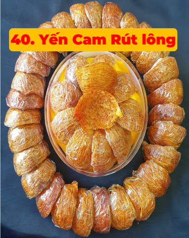 Yến Cam Rút Lông là loại tổ yến có Cam nhạt hoặc Hồng nhạt. Yến Cam có màu đỏ là do sự tương tác giữa nước bọt của chim yến với các khoáng chất tự nhiên như sắt, canxi, magie… trên vách đá hang động. Yến Cam thường có giá thành cao hơn các loại tổ yến khác do sự khan hiếm và giá trị dinh dưỡng mang lại.