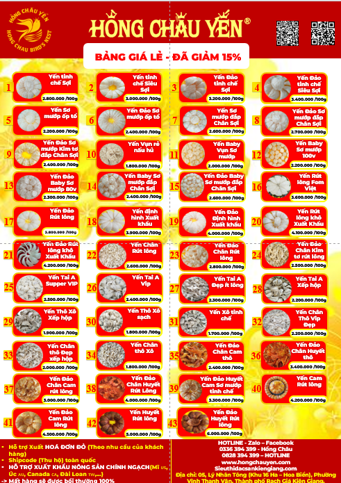 - BẢNG GIÁ LẺ - TỔ YẾN (Đã giảm 10%)